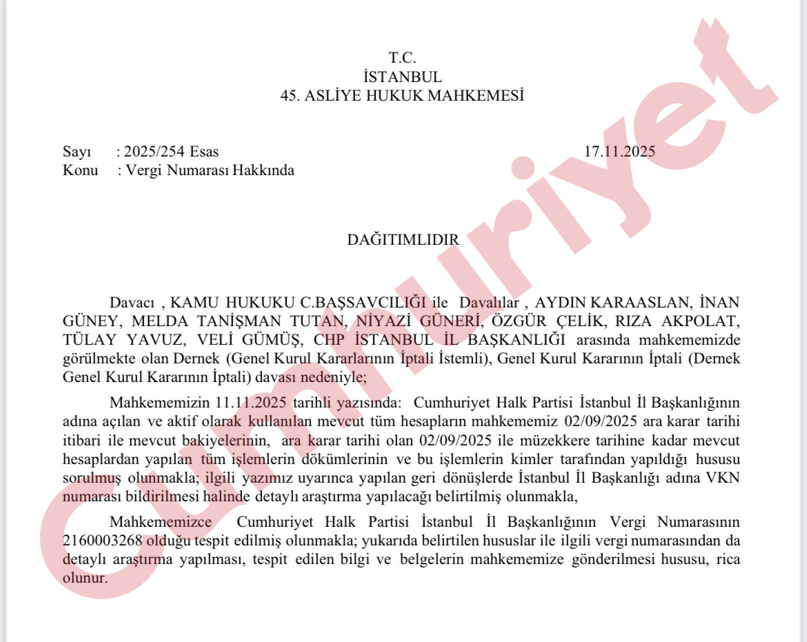 CHP İstanbul İl Başkanlığı’na kayyım olarak atanan Gürsel Tekin, bankalardan CHP İstanbul İl Başkanlığı adına açılan ve aktif olarak kullanılan mevcut tüm hesapların mevcut bakiyelerinin, mevcut hesaplardan yapılan tüm işlemlerin dökümlerinin ve bu işlemlerin kimler tarafından yapıldığının bildirilmesini talep etti.