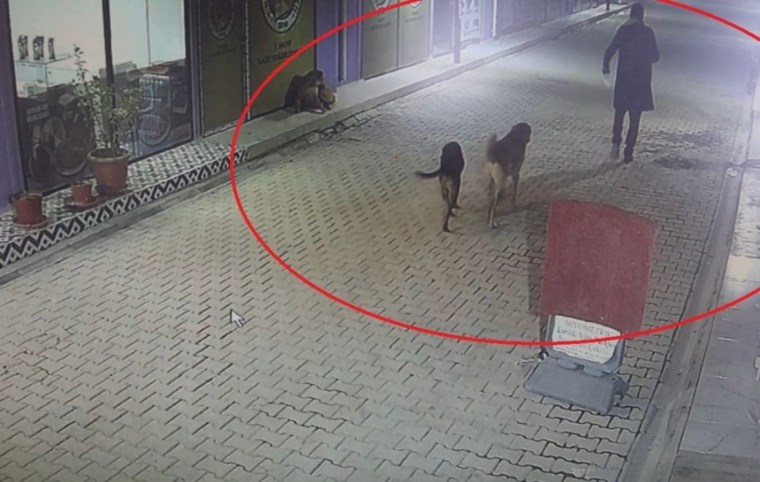 Güvenlik kamerası görüntülerini izleyen esnaf, kimliği belirsiz kişinin yanında 3 sokak köpeğiyle gelip, iş yerlerinin etrafında dolaştığını gördü.