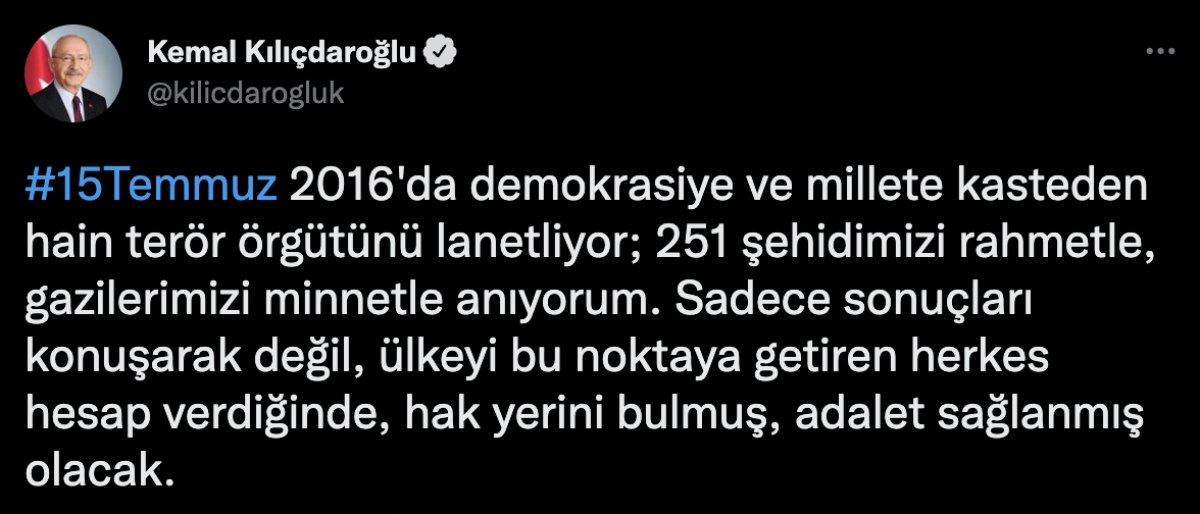 Kılıçdaroğlu Twitter’dan yaptığı paylaşımda, “15 Temmuz 2016’da demokrasiye ve millete kasteden hain terör örgütünü lanetliyor; 251 şehidimizi rahmetle, gazilerimizi minnetle anıyorum. Sadece sonuçları konuşarak değil, ülkeyi bu noktaya getiren herkes hesap verdiğinde, hak yerini bulmuş, adalet sağlanmış olacak.” dedi.
