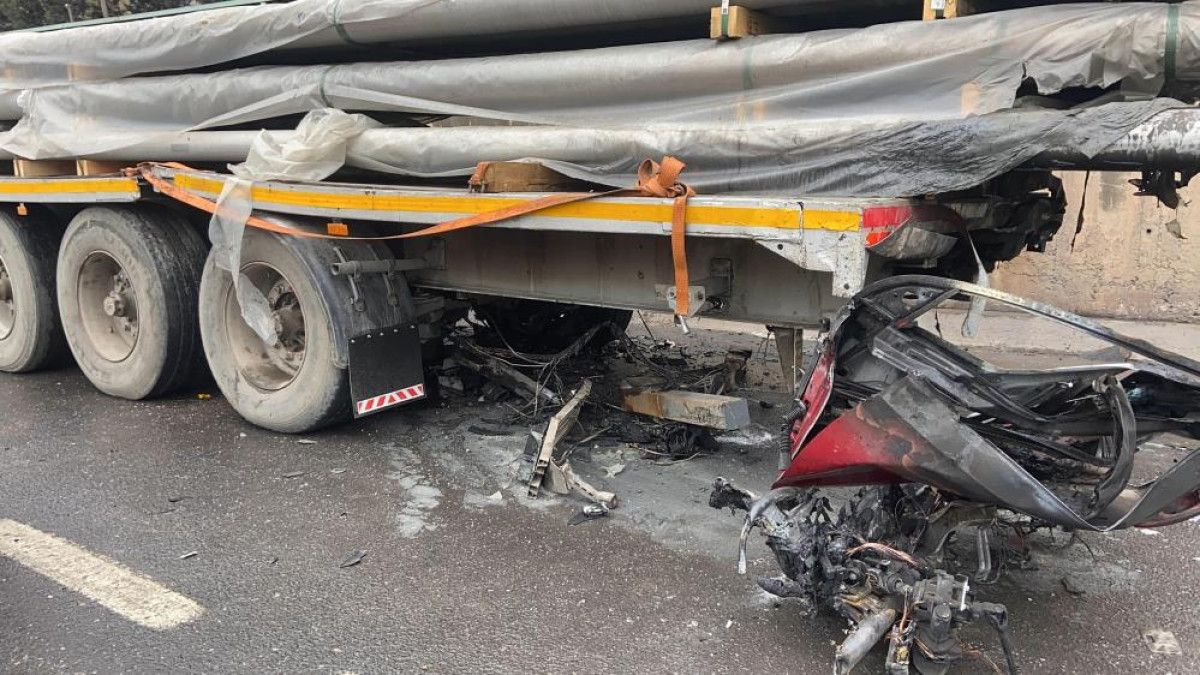 Çarpmanın şiddetiyle tırın altına giren otomobilde yangın çıktı, sürücü ise sıkıştı.