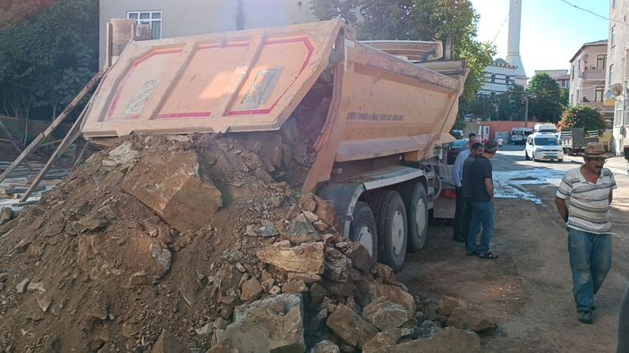 Hafriyat kamyonundaki malzemeler sokağa döküldüğü görülürken polis olayla ilgili inceleme başlattı.