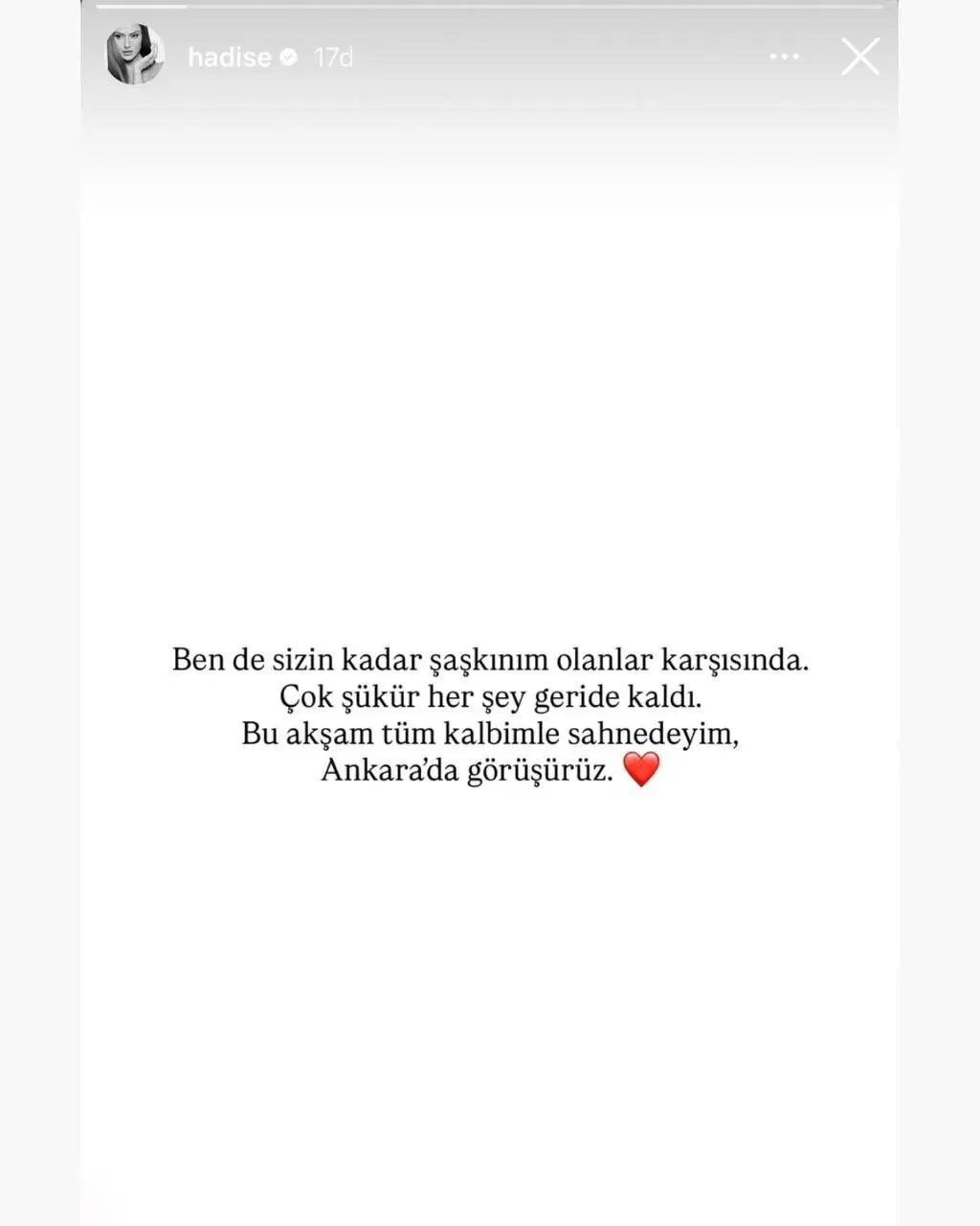 “Ben de sizin kadar şaşkınım olanlar karşısında. Çok şükür her şey geride kaldı. Bu akşam tüm kalbimle sahnedeyim, Ankara’da görüşürüz”