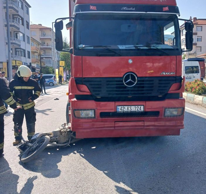 Konya’nın Akşehir ilçesi İstasyon Mahallesi’nde Mustafa Kemal Paşa Caddesi’nden İstasyon Caddesi’ne dönmeye hazırlanan Gürcan Coşkun (46) idaresindeki plakasız motosiklet, aynı istikametten caddeye dönmek isteyen D.K. yönetimindeki kamyonun altına girdi.