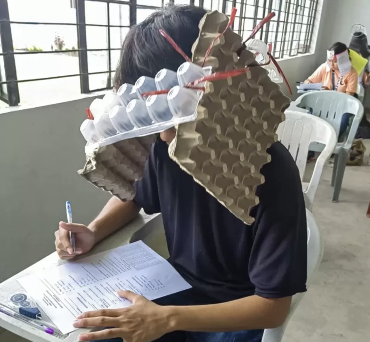 Filipinler’in Legazpi kentindeki üniversitede, öğrencilerden diğerlerinin kağıtlarına bakmayı engelleyecek başlıklar takması istendi. Öğrenciler ise bu talebe, kartonlar, yumurta kutuları ve öbür birtakım geri dönüştürülmüş unsurlardan yaptıkları mesken imali düzenekler tasarlayarak karşılık verdi. Öğretmen, derslerinde “dürüstlük” sağlamak için bu “eğlenceli yolu” bulduklarını söyledi.