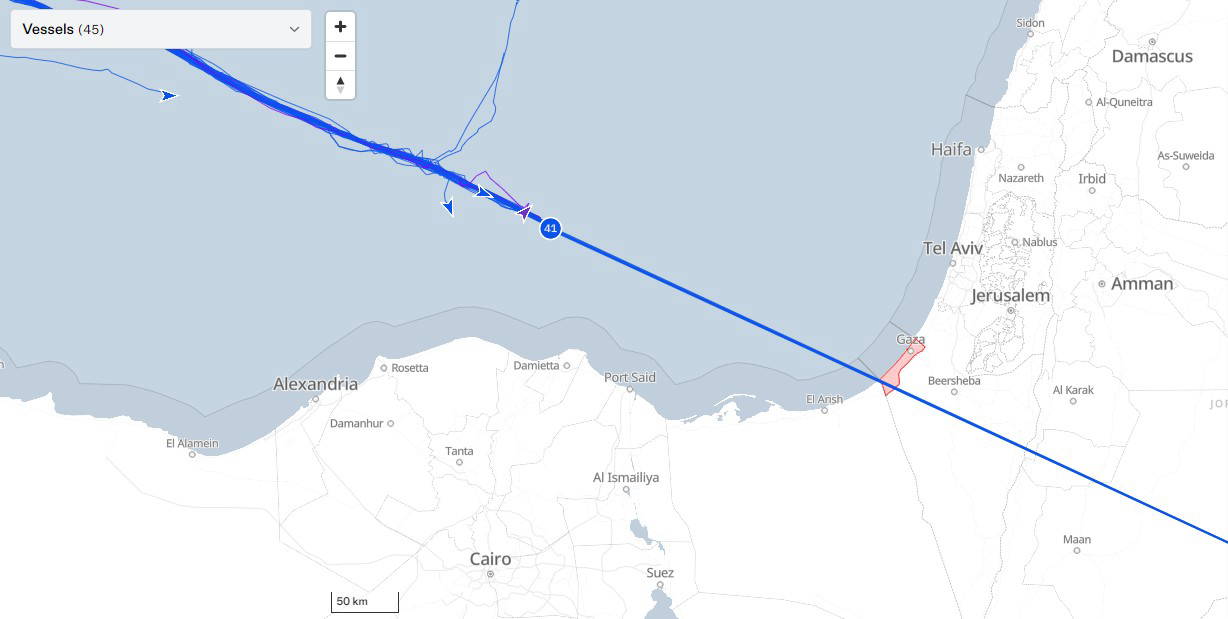 Filodaki Adagio gemisinde bulunan Türk aktivist Muhammed Salih, sosyal medya hesabından paylaştığı videoda, filoya 80 kilometre (50 mil) uzaklıkta bir İsrail Donanması gemisinin saptandığını bildirdi.