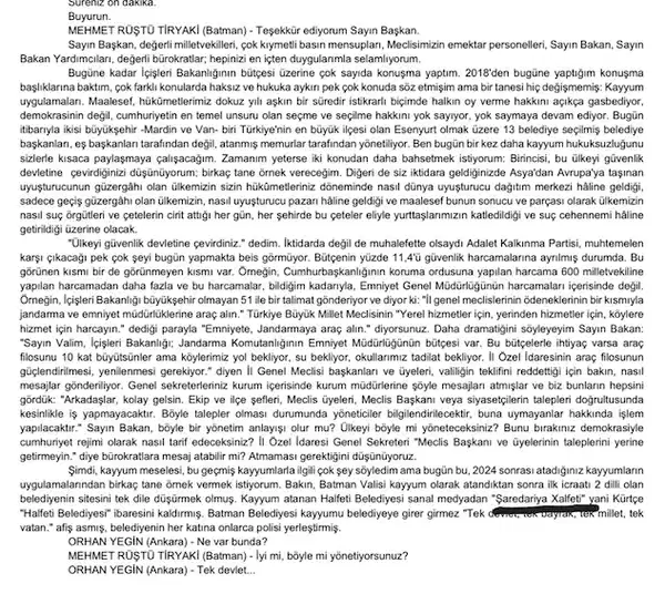 Görüşmelerde İçişleri Bakanı Ali Yerlikaya’nın bütçe sunumunun ardından milletvekilleri söz aldı. DEM Parti milletvekilleri Dilan Kunt Ayan ile Mehmet Rüştü Tiryaki’nin konuşmalarında kullandıkları Kürtçe kelimeler ilk kez TBMM tutanaklarına yansıdı. Tiryaki, “Jin kart” ve “Şaredariya Xelfetî” (Halfeti Belediyesi) ifadelerini Kürtçe kullandı.