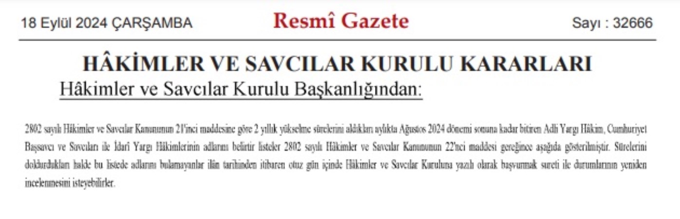HSK’nin bir başka kararında ise 2 yıllık yükselme sürelerini aldıkları aylıkta Ağustos 2024 dönemi sonuna kadar bitiren adli yargı hakim, Cumhuriyet başsavcı ve savcıları ile idari yargı hakimlerinin adlarının bulunduğu listeler de yayımlandı.