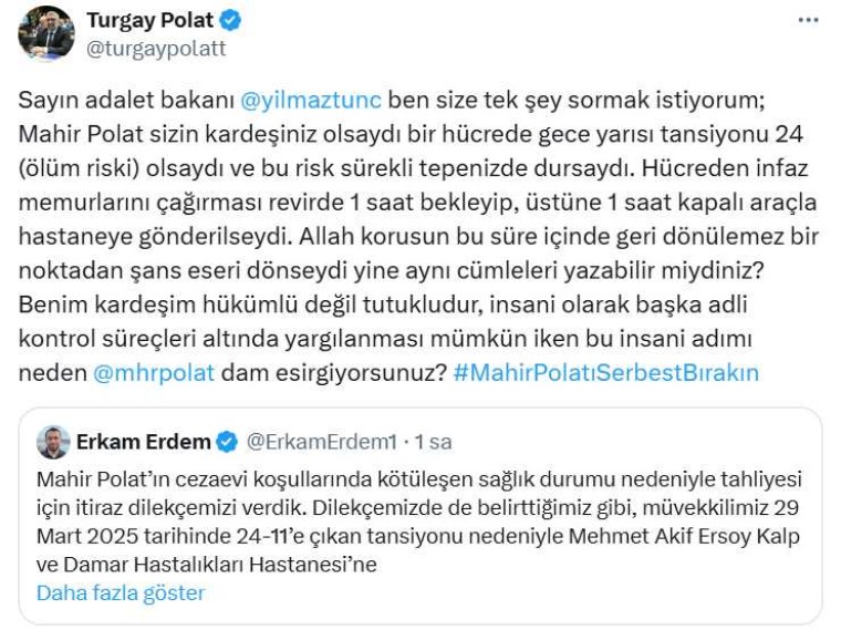 “Sayın Adalet Bakanı Yılmaz Tunç ben size tek şey sormak istiyorum; Mahir Polat sizin kardeşiniz olsaydı bir hücrede gece yarısı tansiyonu 24 (ölüm riski) olsaydı ve bu risk sürekli tepenizde dursaydı. Hücreden infaz memurlarını çağırması revirde 1 saat bekleyip, üstüne 1 saat kapalı araçla hastaneye gönderilseydi. Allah korusun bu süre içinde geri dönülemez bir noktadan şans eseri dönseydi yine aynı cümleleri yazabilir miydiniz?