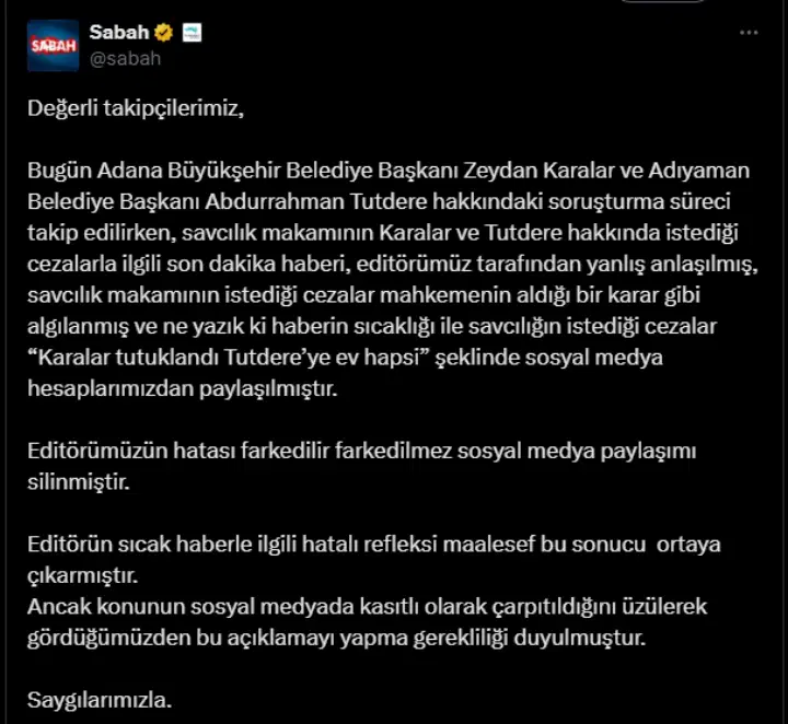 “Bugün Adana Büyükşehir Belediye Başkanı Zeydan Karalar ve Adıyaman Belediye Başkanı Abdurrahman Tutdere hakkındaki soruşturma süreci takip edilirken, savcılık makamının Karalar ve Tutdere hakkında istediği cezalarla ilgili son dakika haberi, editörümüz tarafından yanlış anlaşılmış, savcılık makamının istediği cezalar mahkemenin aldığı bir karar gibi algılanmış ve ne yazık ki haberin sıcaklığı ile savcılığın istediği cezalar “Karalar tutuklandı Tutdere’ye ev hapsi” şeklinde sosyal medya hesaplarımızdan paylaşılmıştır.