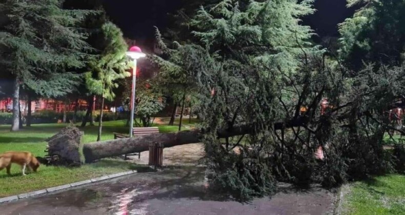 Malatya’da, akşam saatlerinde etkili olan sağanak yağış fırtına ile birleşince ağaçlar devrilerek yola düştü.
