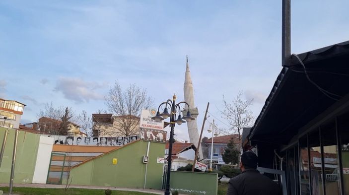 Yıkım kararının akabinde yaya ve araç trafiğine kapatılan bölgeye gelen gruplar, vinçle minareye halat bağladı.