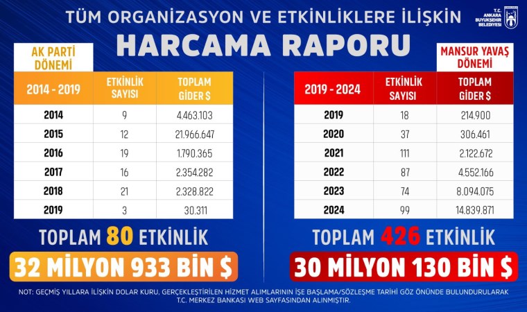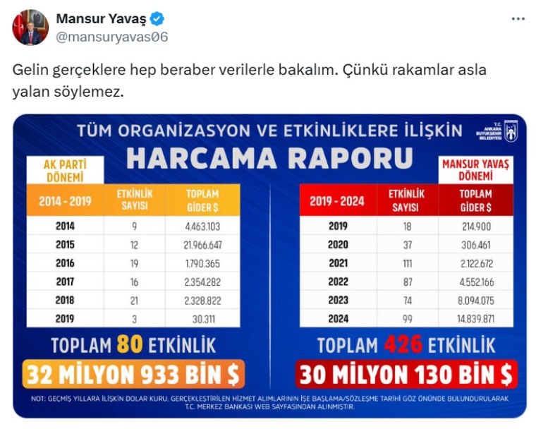 AKP ve CHP döneminin karşılaştırılmasına yer verilen paylaşımda, 2014-2019 AKP döneminde 80 etkinlik için toplam 32 milyon 933 bin dolar ödendiği ortaya çıkarken; CHP‘li başkan Mansur Yavaş döneminde ise 426 etkinlik için 30 milyon 130 bin dolar harcandığı aktarıldı.