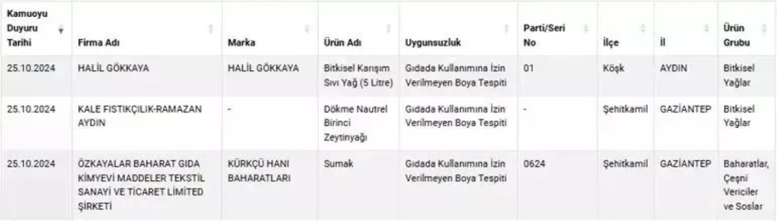 Son testlerde bitkisel yağ ve zeytinyağı yerine boya, sumakta gıdada kullanılmaması gereken boya, çiğ sütte yağ oranının düşürülmesi köfte yerine soya satılması, ballarda taklit ya da tağşiş, sade yağda inek sütü, yoğurt yerine nişasta satıldığı ortaya çıktı.