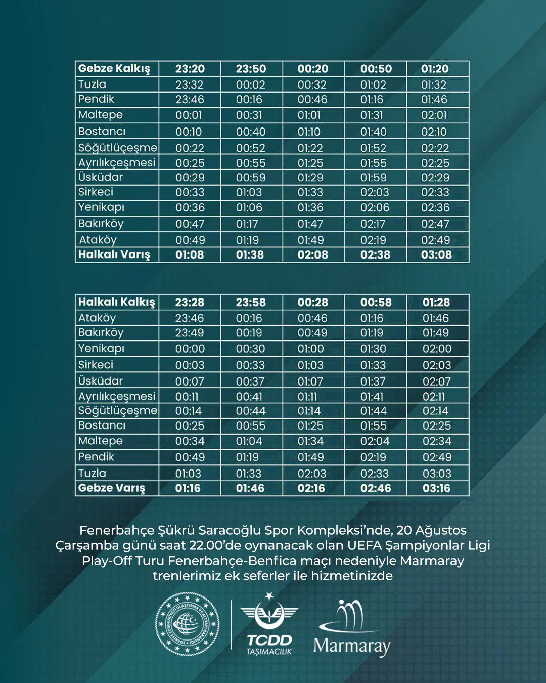 “Fenerbahçe Şükrü Saracoğlu Spor Kompleksi’nde, 20 Ağustos Çarşamba günü saat 22.00’de oynanacak UEFA Şampiyonlar Ligi Play-Off Turu Fenerbahçe-Benfica karşılaşması nedeniyle Marmaray Gebze-Halkalı hattında ek tren seferleri düzenlenecektir.