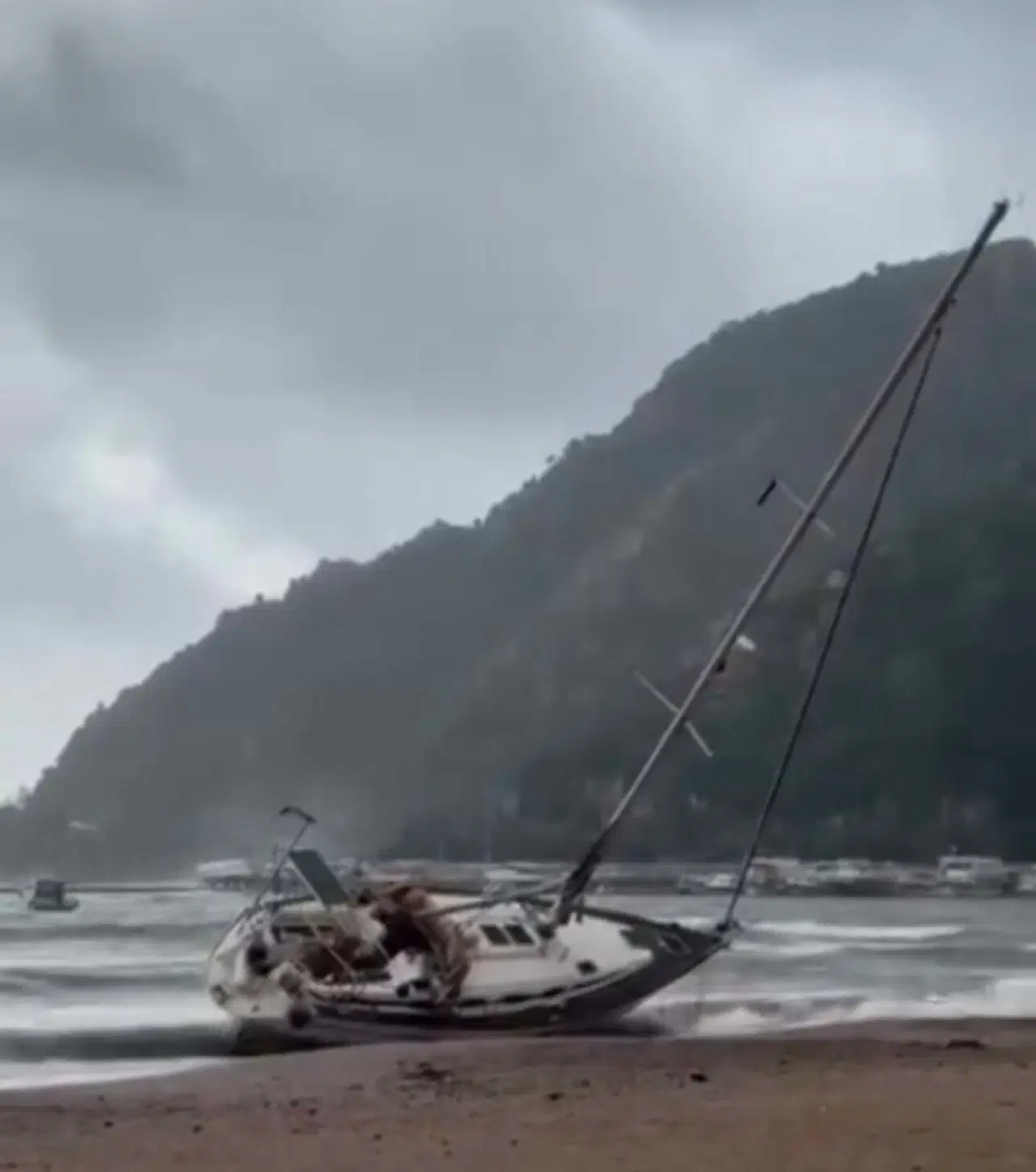 Fırtına günlük yaşamı olumsuz etkilerken İçmeler Mahallesi’nde demirli bulunan bir yelkenli tekne, dalgaların etkisiyle karaya oturdu.