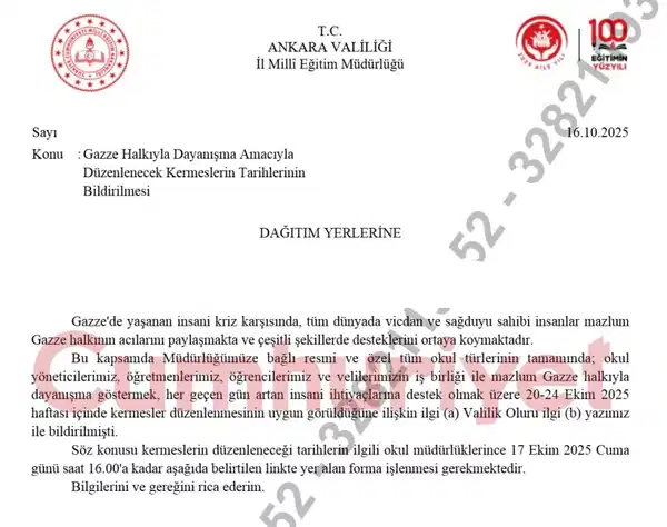 Bakanlıktan il milli eğitim müdürlüklerine gönderilen yazıda, “Gazze halkının acılarını paylaşmak ve artan insani ihtiyaçlarına destek olmak amacıyla” kermeslerin 20–24 Ekim 2025 haftasında yapılmasının uygun görüldüğü belirtildi.