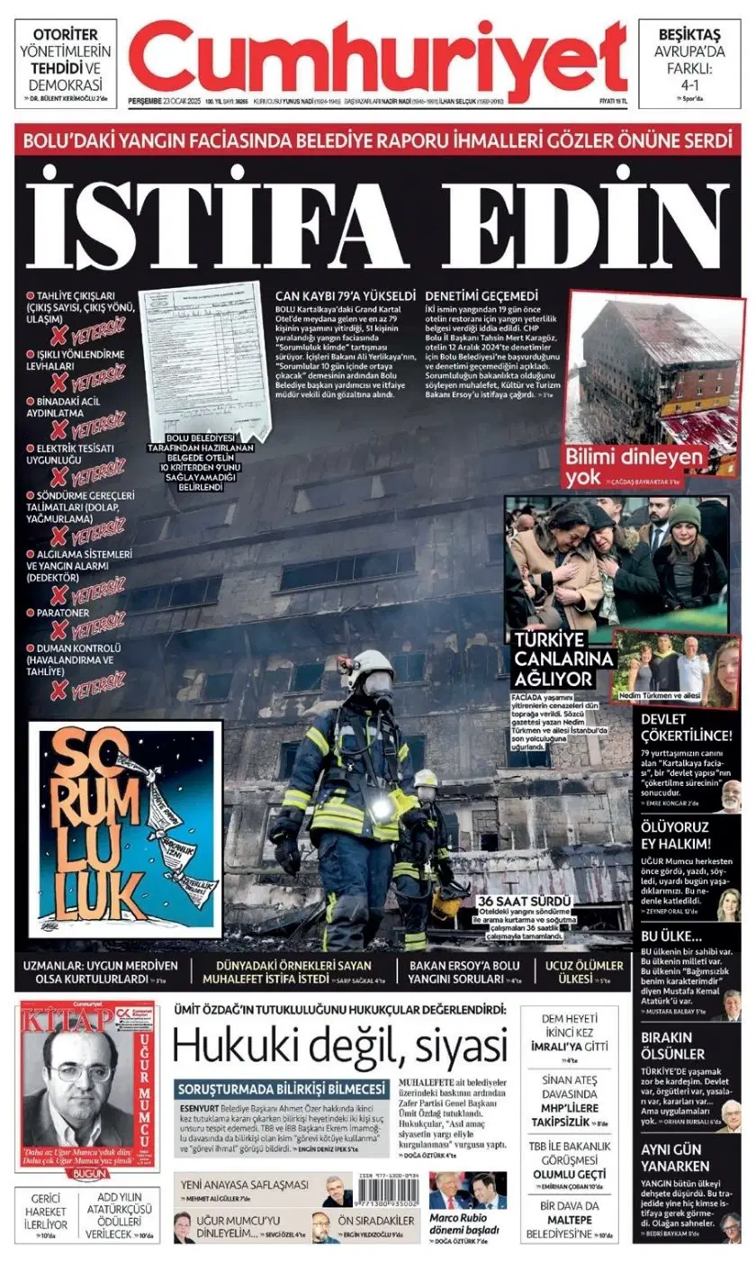 Yangının en acı fotoğraflarından birini ilk sayfasına taşıyan Cumhuriyet, “Sorumluluk kimde?” sorusunu gündeme getirmişti. Gazete, yıllarca denetlenmeden faaliyet gösteren otelle ilgili ihmalleri sıralayarak yetkililere açıkça “İstifa edin!” çağrısında bulundu.