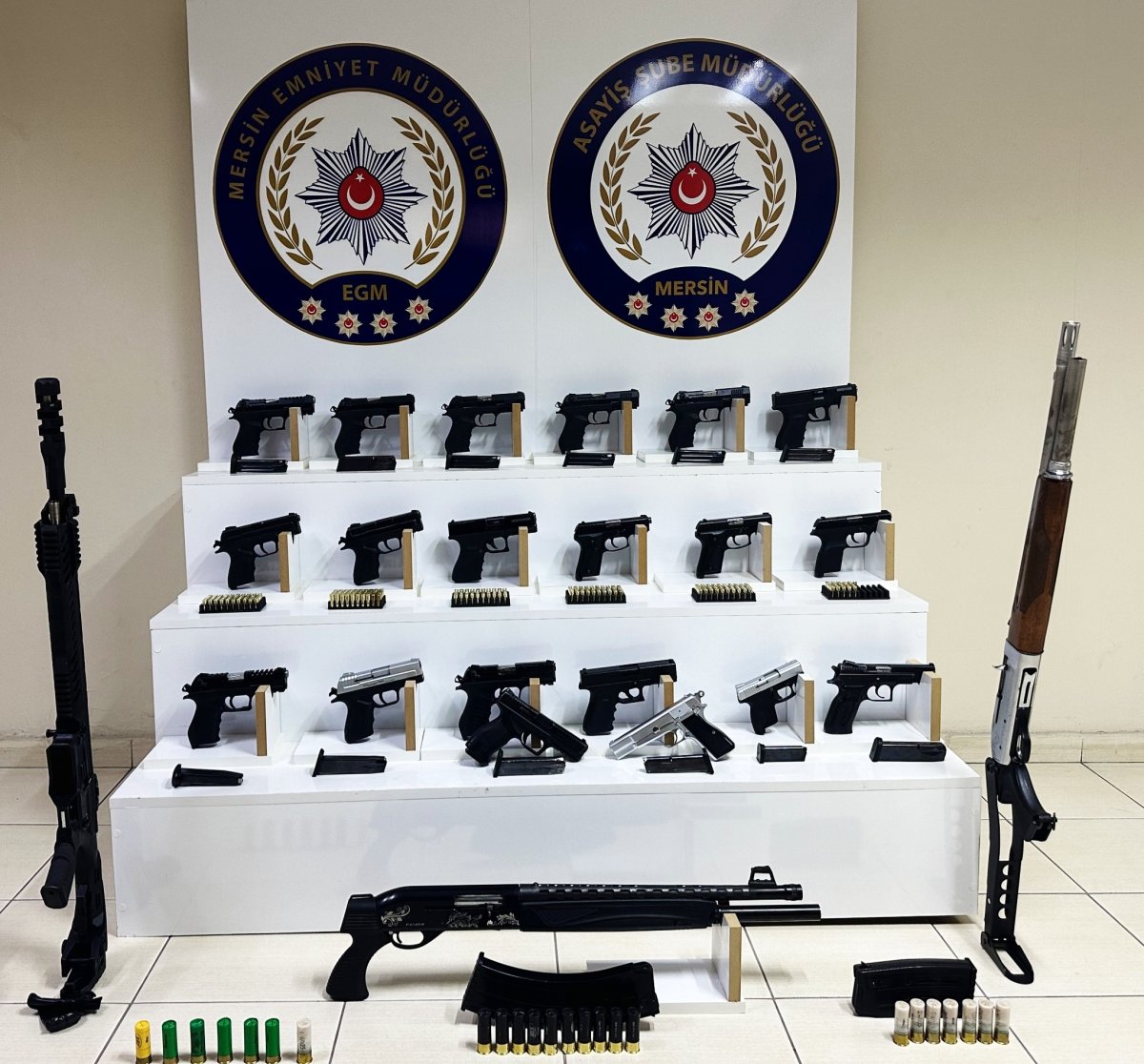 Şahısların adreslerinde yapılan aramalarda 20 ruhsatsız tabanca, 3 pompalı tüfek, 412 fişek, bir miktar uyuşturucu madde ile çok sayıda suç unsuru ele geçirildi.