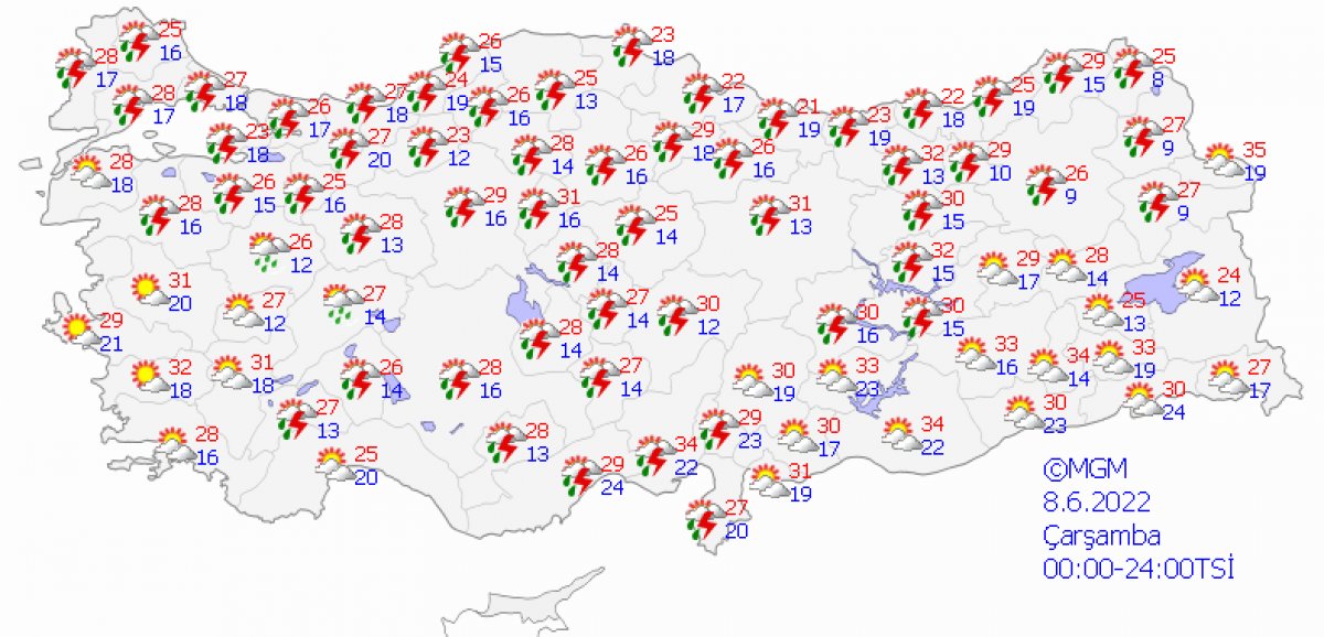 Açıklanan son verilere göre kuzey, iç ve batı kesimlerinin parçalı ve yer yer çok bulutlu, Trakya Kesimi, Batı Akdeniz, (Eskişehir ve Sivas hariç) İç Anadolu ile öğle saatlerinden sonra (Bursa ve Bilecik hariç) Marmara, İç Anadolu’nun güney ve doğusu, Göller Yöresi, (Gümüşhane ve Bayburt hariç) Karadeniz’in iç kesimleri, Çankırı ve Hakkari çevreleri ile Ankara’nın kuzey ilçelerinin yerel sağanak ve gök gürültülü sağanak yağışlı olacağı bekleniyor.