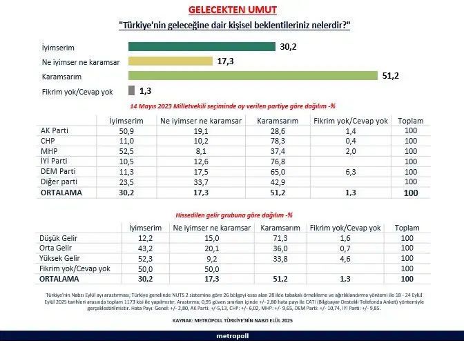 MetroPOLL Araştırma’nın eylül ayında yaptığı “Gelecekten Umut” araştırması, toplumun büyük çoğunluğunun ülkenin geleceğine dair umutsuz olduğunu ortaya koydu.