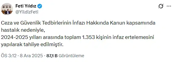 “Ceza ve Güvenlik Tedbirlerinin İnfazı Hakkında Kanun kapsamında hastalık nedeniyle, 2024-2025 yılları arasında toplam 1.353 kişinin infaz ertelemesini yapılarak tahliye edilmiştir.”