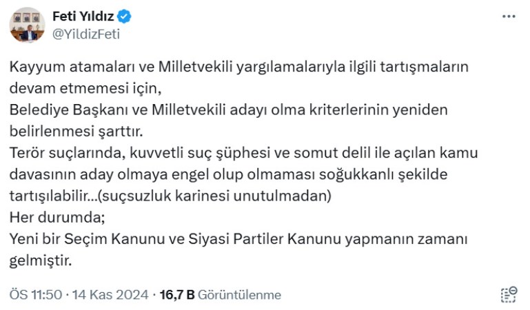 “Kayyum atamaları ve Milletvekili yargılamalarıyla ilgili tartışmaların devam etmemesi için, Belediye Başkanı ve Milletvekili adayı olma kriterlerinin yeniden belirlenmesi şarttır. Terör suçlarında, kuvvetli suç şüphesi ve somut delil ile açılan kamu davasının aday olmaya engel olup olmaması soğukkanlı şekilde tartışılabilir…(suçsuzluk karinesi unutulmadan) Her durumda; Yeni bir Seçim Kanunu ve Siyasi Partiler Kanunu yapmanın zamanı gelmiştir.”