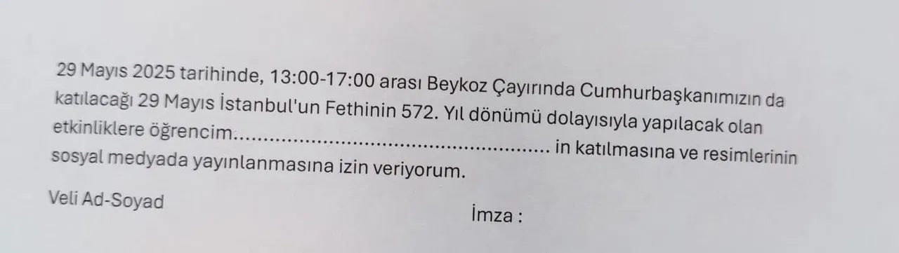 Öte yandan Beykoz’da bulunan Ayşe Eda Özdemir Ortaokulu’ndaki velilerden öğrencilerin programa katılması için izin istendi. Velilere, “29 Mayıs 2025 Perşembe günü “İstanbul’un Fethi”nin yıl dönümü kapsamında Beykoz çayırında düzenlenecek olan tören programına Cumhurbaşkanımız Sayın Recep Tayyip Erdoğan katılacaktır. Okulumuzun görevli olduğu bu programa öğrencimin katılmasını uygun görüyorum” yazılı izin istek kağıdı gönderildi.