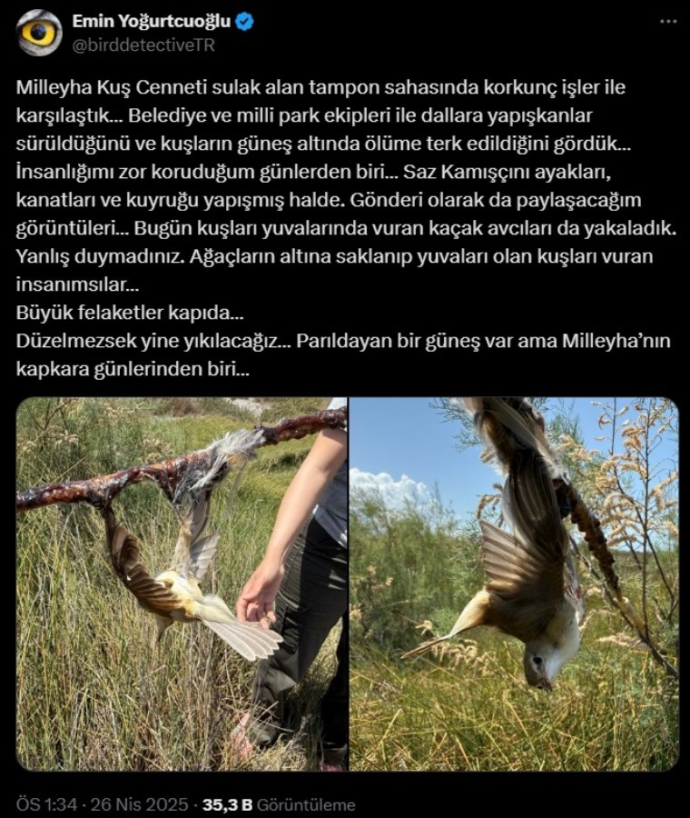Yoğurtçuoğlu, X hesabından yaptığı paylaşımda, “Milleyha Kuş Cenneti sulak alan tampon sahasında korkunç işler ile karşılaştık… Belediye ve milli park ekipleri ile dallara yapışkanlar sürüldüğünü ve kuşların güneş altında ölüme terk edildiğini gördük… İnsanlığımı zor koruduğum günlerden biri… Saz Kamışçını ayakları, kanatları ve kuyruğu yapışmış halde. Gönderi olarak da paylaşacağım görüntüleri… Bugün kuşları yuvalarında vuran kaçak avcıları da yakaladık. Yanlış duymadınız. Ağaçların altına saklanıp yuvaları olan kuşları vuran insanımsılar” dedi.