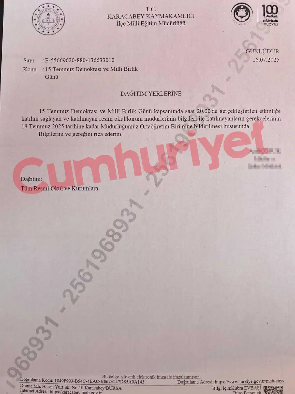 Yazıda “15 Temmuz Demokrasi ve Milli Birlik Günü kapsamında 20.00’de gerçekleştirilen etkinliğe katılım sağlayan ve katılmayan resmi okul/kurum müdürlerinin bilgileri ile katılmayanların gerekçelerinin 18 Temmuz 2025 tarihine kadar Müdürlüğümüz Ortaöğretim Birimine bildirilmesi hususunda; bilgilerini ve gereğini rica ederim” ifadeleri yer aldı.