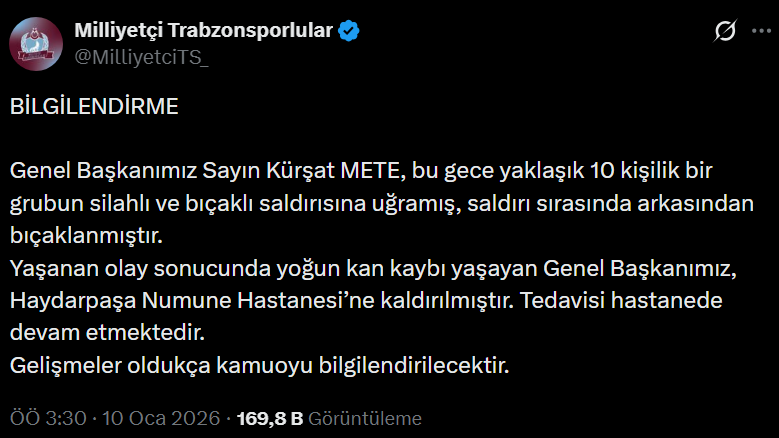 Milliyetçi Trabzonsporlular Derneği Başkanı Küşat Mete‘ye silahlı ve bıçaklı saldırı düzenlendi.