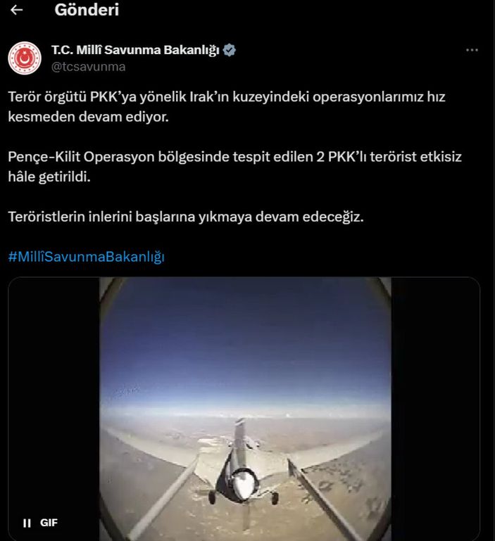 2 PKK’lı teröristin etkisiz hale getirildiğini Twitter hesabından paylaştığı bir video ile duyurdu.