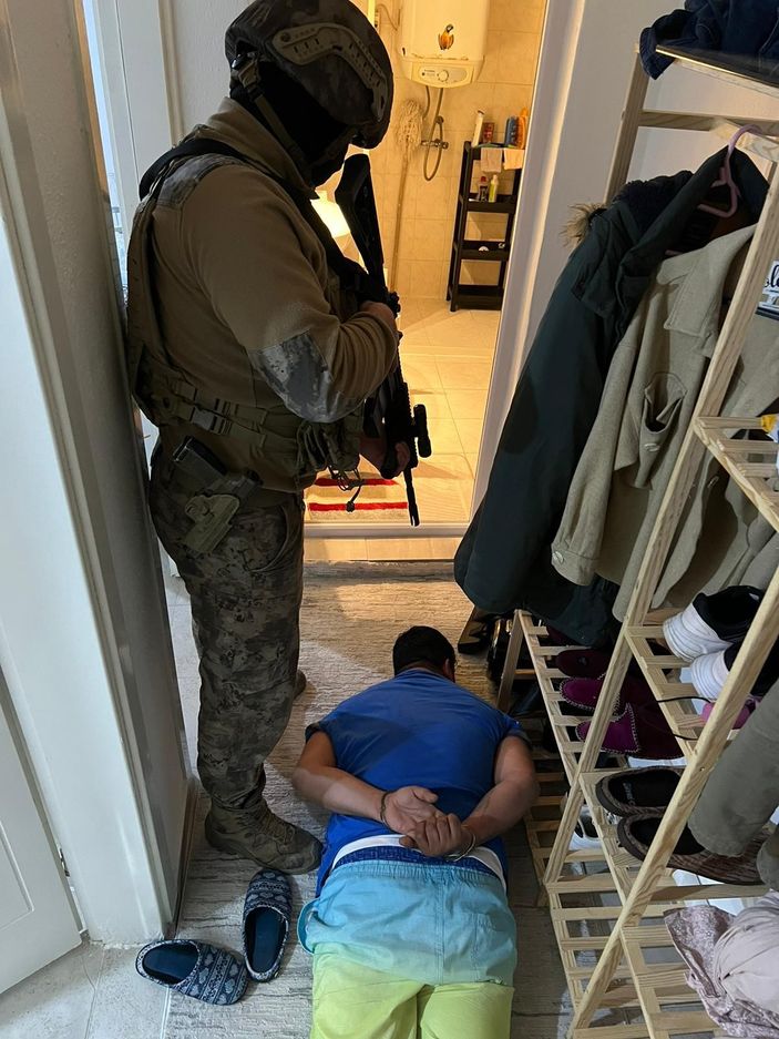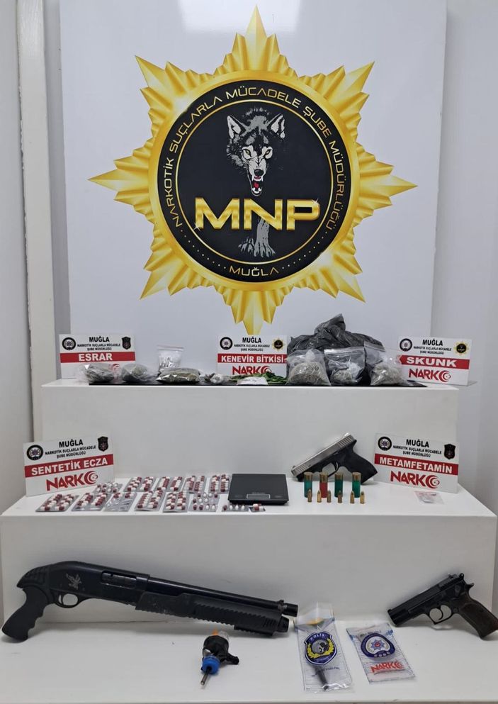 Ev ve iş yerlerindeki aramalarda 412 gram esrar, 205 gram metamfetamin, 117 gram skunk, 65 gram ketamin, 17 kök kenevir bitkisi, 151 sentetik hap, 2 hassas terazi, 1 ruhsatsız tabanca, 4 ruhsatsız tüfek ve 15 mermi geçirildi.
