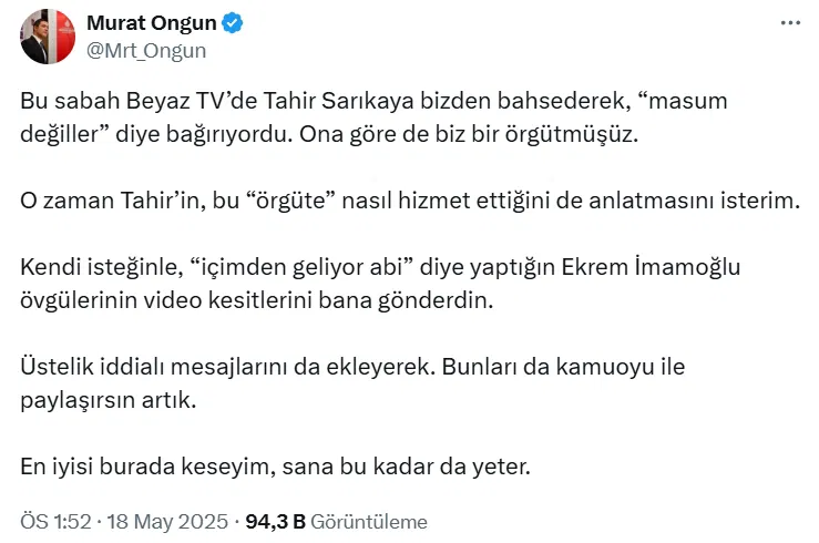 Silivri’de tutuklu bulunan Murat Ongun, X hesabından yaptığı yeni paylaşımda, Beyaz TV sunucusu Tahir Sarıkaya’nın açıklamalarına yanıt verdi.