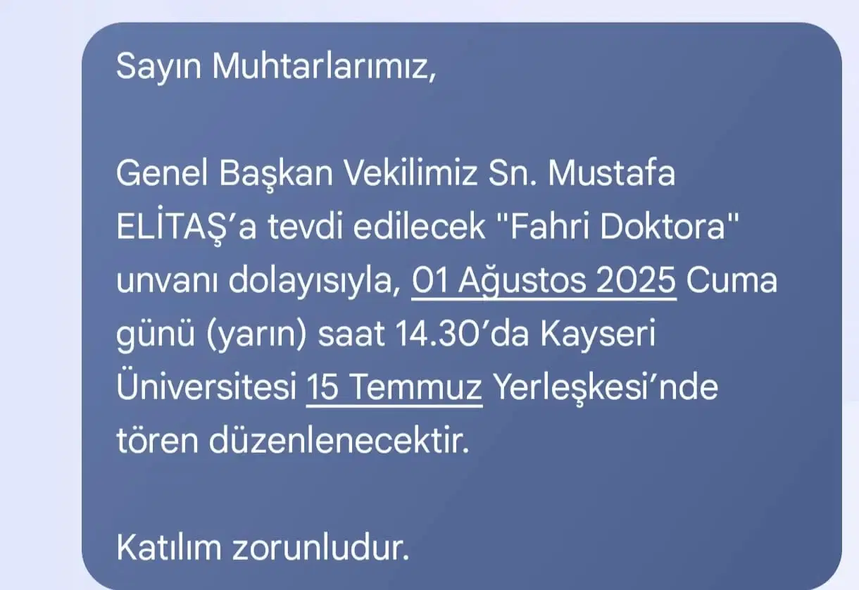 “Sayın Muhtarlarımız, Genel Başkan Vekilimiz Sn. Mustafa ELİTAŞ’a tevdi edilecek ‘Fahri Doktora’ unvanı dolayısıyla, 01 Ağustos 2025 Cuma günü saat 14.30’da Kayseri Üniversitesi 15 Temmuz Yerleşkesi’nde tören düzenlenecektir. Katılım zorunludur.”