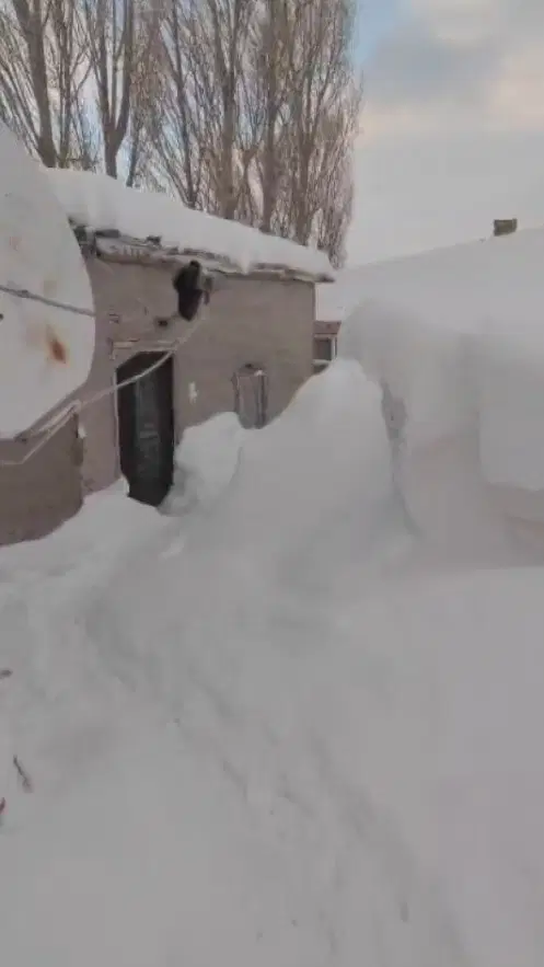 Köyde yaşayan Bilal Erdoğan, kar üzerinde yürüyerek ahırının çatısına çıktığı anları görüntüledi.