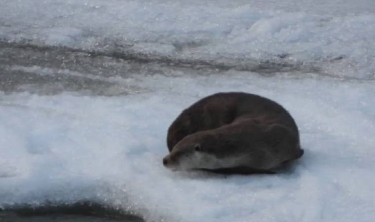 Erzurum’un İspir ilçesinde görülen su samuru, Çoruh Nehri‘nin buz tutan kıyılarında dakikalarca eğlendikten sonra suya girerek kayboldu.