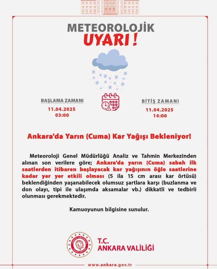 Valiliğin sosyal medya hesabından yapılan açıklamada, Meteoroloji Genel Müdürlüğü Analiz ve Tahmin Merkezi’nden alınan verilere göre; 11 Nisan Cuma günü sabah ilk saatlerden itibaren başlayacak kar yağışının öğle saatlerine kadar yer yer etkili olması (5 ila 15 cm arası kar örtüsü) beklendiği belirtilerek, “Yaşanabilecek olumsuz şartlara karşı (buzlanma ve don olayı, tipi ile ulaşımda aksamalar vb.) dikkatli ve tedbirli olunması gerekmektedir” denildi.