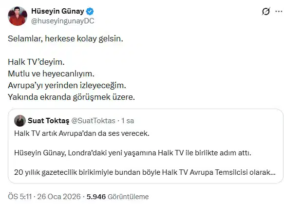 “Selamlar, herkese kolay gelsin. Halk TV’deyim. Mutlu ve heyecanlıyım. Avrupa’yı yerinden izleyeceğim. Yakında ekranda görüşmek üzere.”