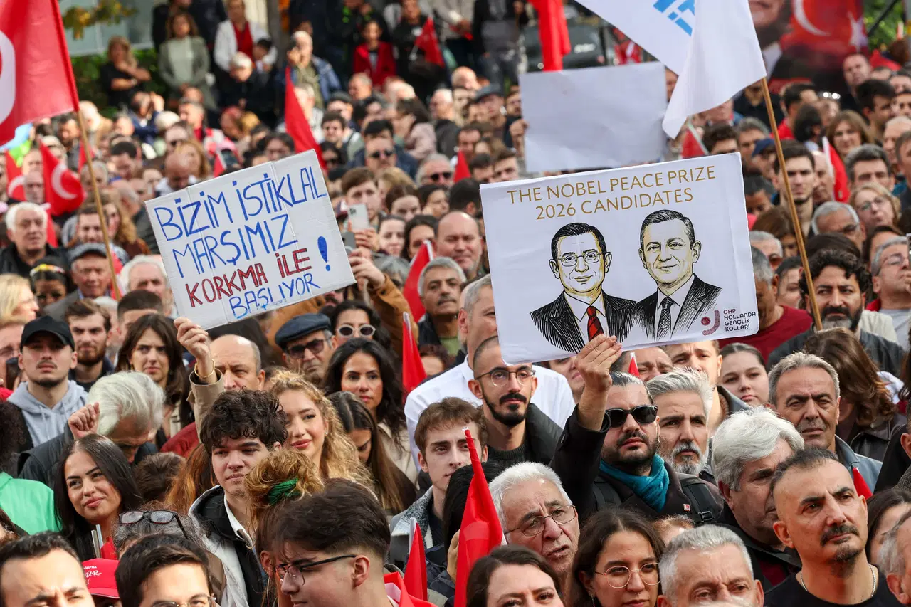 “The Nobel Peace Prize 2026 Candidates: İmamoğlu and Özel (2026 Nobel Barış Ödülü Adayları: İmamoğlu ve Özel)”, “Power is rented, we are landllords (Güç kiralıktır, biz ev sahibiyiz)”, “One men to rule them all? No, we want democracy (Her şeyi yönetmek için tek adam? Hayır biz demokrasi istiyoruz)”, “Free İmamoğlu (İmamoğlu’na özgürlük)”, “Democracy can’t be jailed (Demokrasi hapsedilemez)”, “Freedom to the press in Türkiye (Türkiye’deki gazetecilere özgürlük)”, “Speak, stand, defend (Konuş, dur, savun).”