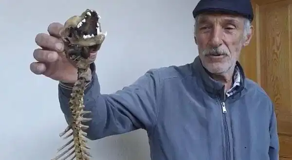 İlçeye bağlı Alanbaşı köyünün eski muhtarı Yavuz Turan, ahırındaki malzemelerin üzerini örttüğü naylonların arasında yırtıcı dişlere sahip, 55 santimetre boyunda hayvan iskeleti buldu.