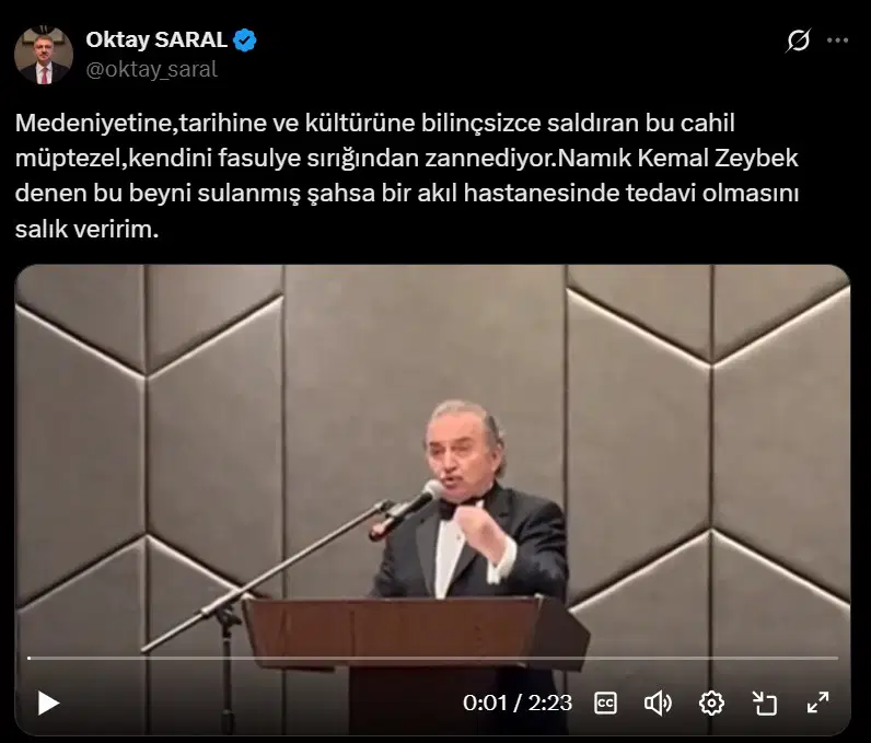 Zeybek’in söz konusu videosunu alıntılayan Saral, “Medeniyetine, tarihine ve kültürüne bilinçsizce saldıran bu cahil müptezel, kendini fasulye sırığından zannediyor. Namık Kemal Zeybek denen bu beyni sulanmış şahsa bir akıl hastanesinde tedavi olmasını salık veririm” ifadelerini kullandı.