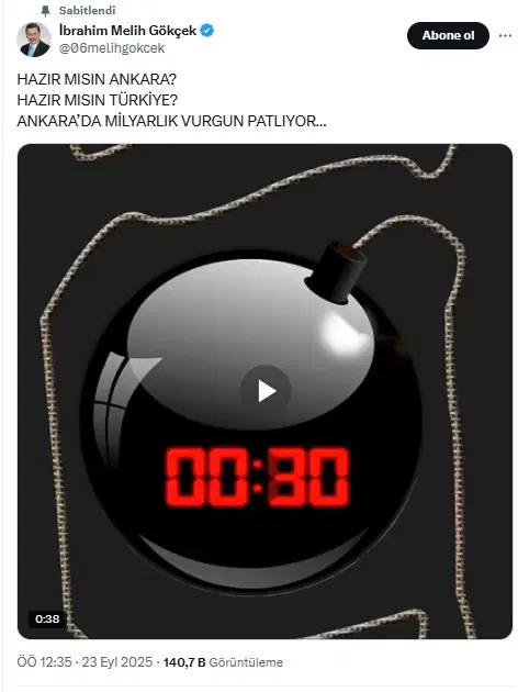 Hakkında birçok yolsuzluk iddiası bulunan Gökçek, gece saatlerinde sosyal medya hesabından “Hazır mısın Ankara? Hazır mısın Türkiye? Ankara’da milyarlık vurgun patlıyor…” ifadeleri yazılı bir paylaşımda bulundu.