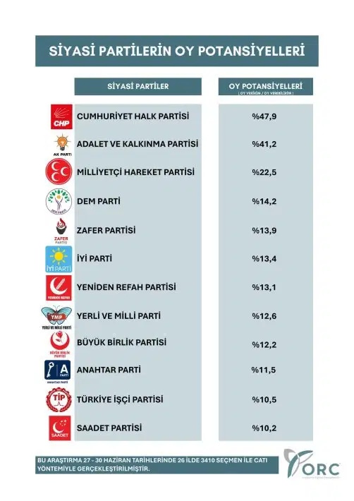 ORC Araştırma, 27-30 Haziran tarihleri arasında 3 bin 410 katılımcı ile yaptığı “Siyasi partilerin oy potansiyelleri” başlıklı çalışmanın sonuçlarını açıkladı.