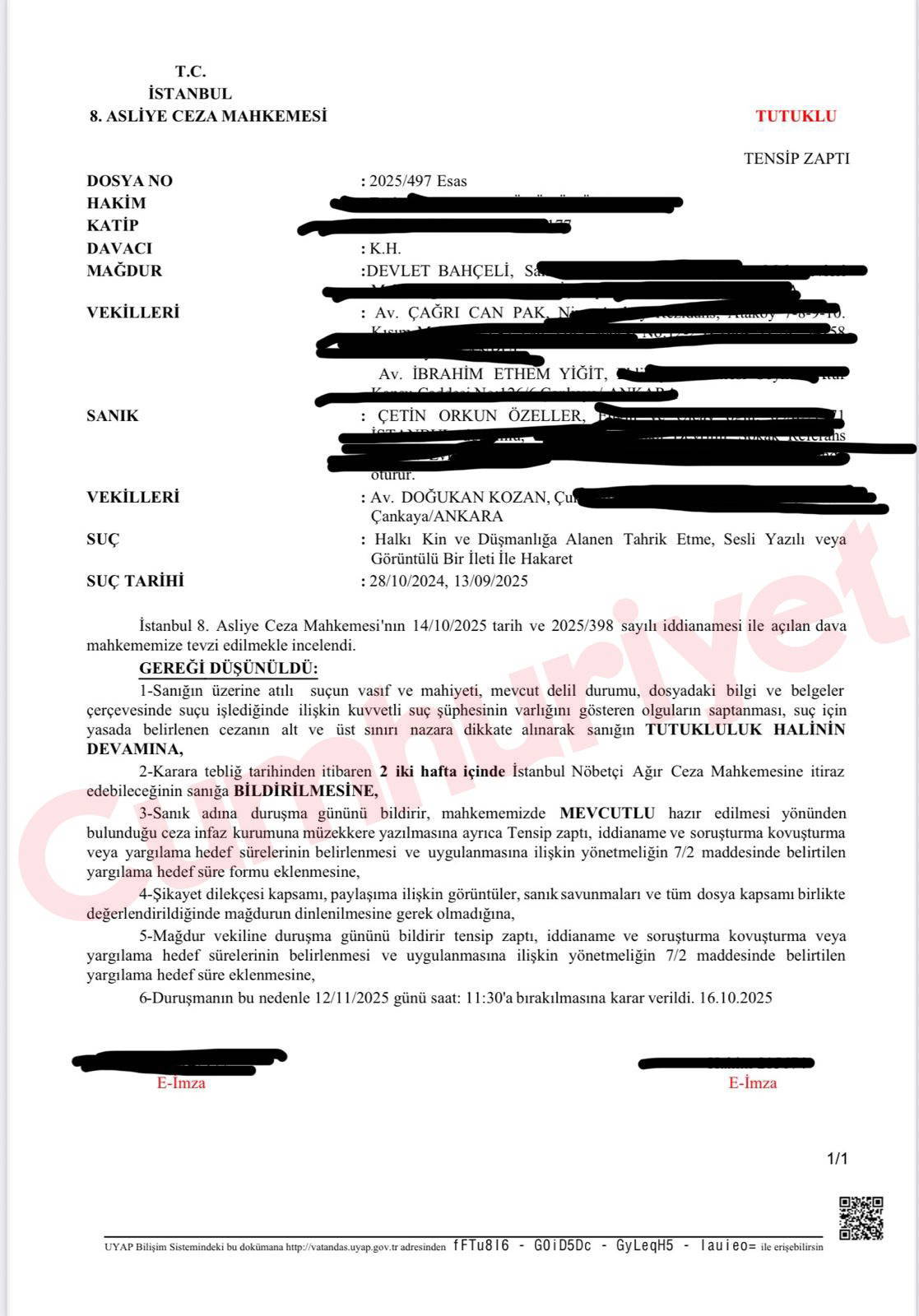 Duruşma beklemeksizin tahliye kararını kullanmayan İstanbul 8. Asliye Mahkemesi, duruşma tarihini ise 12 Kasım 2025 saat 11.30 olarak belirledi.