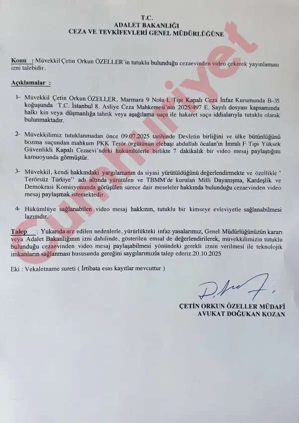 Özeller, Milli Dayanışma, Kardeşlik ve Demokrasi Komisyonundaki sürece ilişkin video mesaj paylaşımı talebinde bulundu.