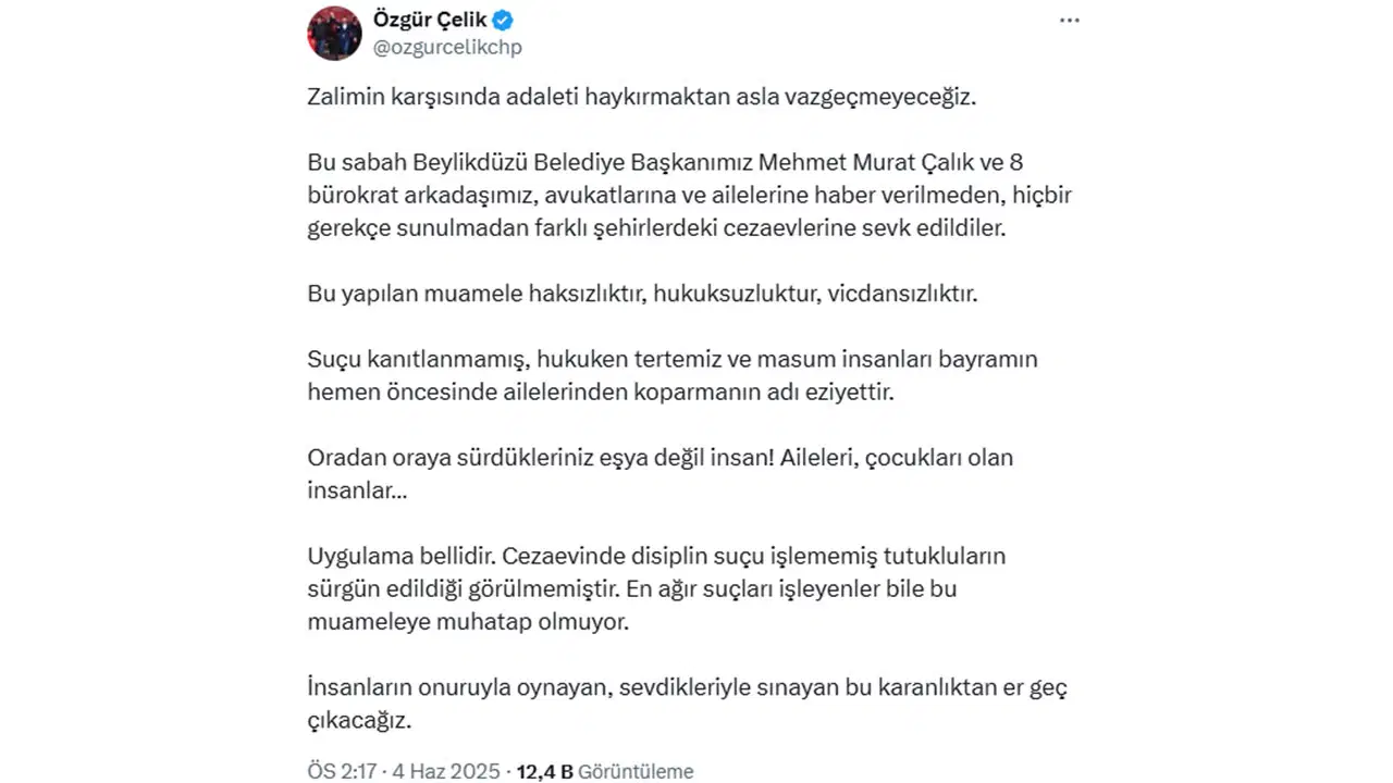 Bu sabah Beylikdüzü Belediye Başkanımız Mehmet Murat Çalık ve 8 bürokrat arkadaşımız, avukatlarına ve ailelerine haber verilmeden, hiçbir gerekçe sunulmadan farklı şehirlerdeki cezaevlerine sevk edildiler.