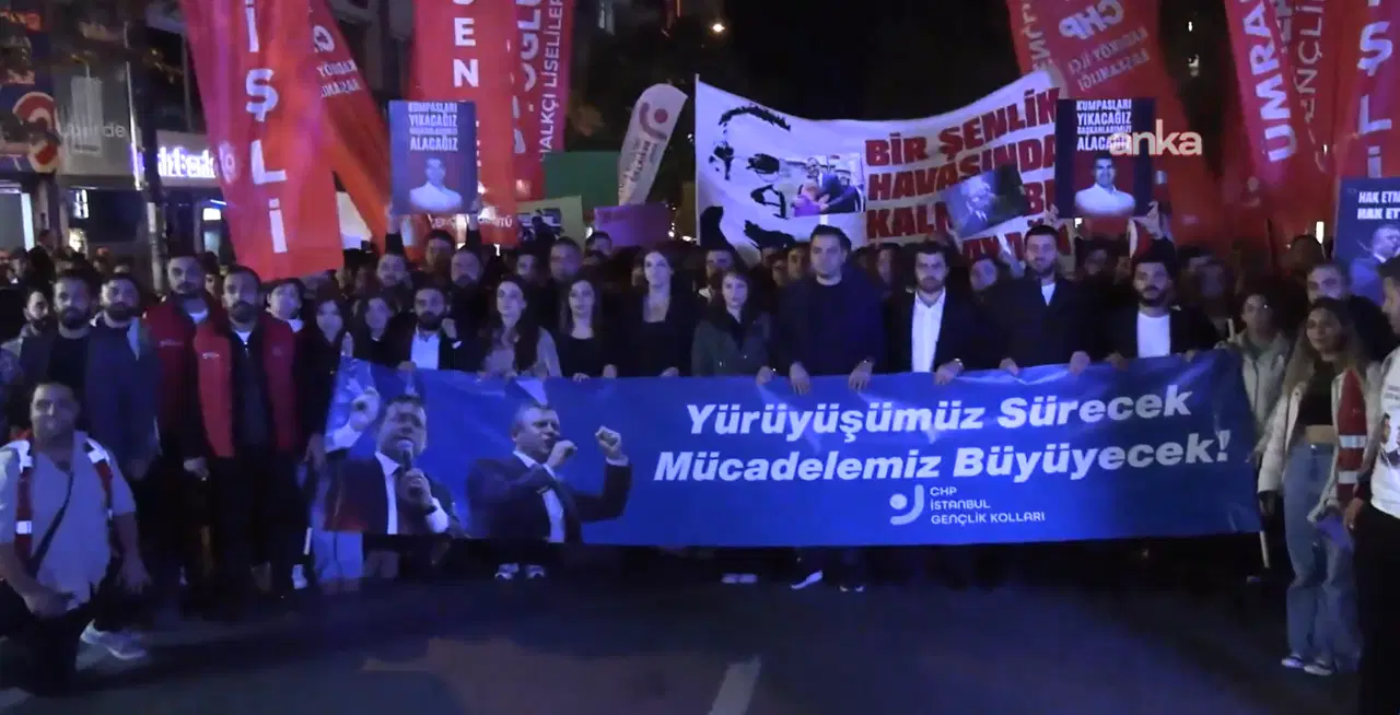 CHP İstanbul Gençlik Kolları üyeleri, Şişli Atatürk Evi Müzesi’nden Mecidiyeköy’e yürüyerek mitinge katıldı. Yürüyüşte tutuklu Şişli Belediye Başkanı Resul Emrah Şahan’ın özgürlüğü için sloganlar atıldı.