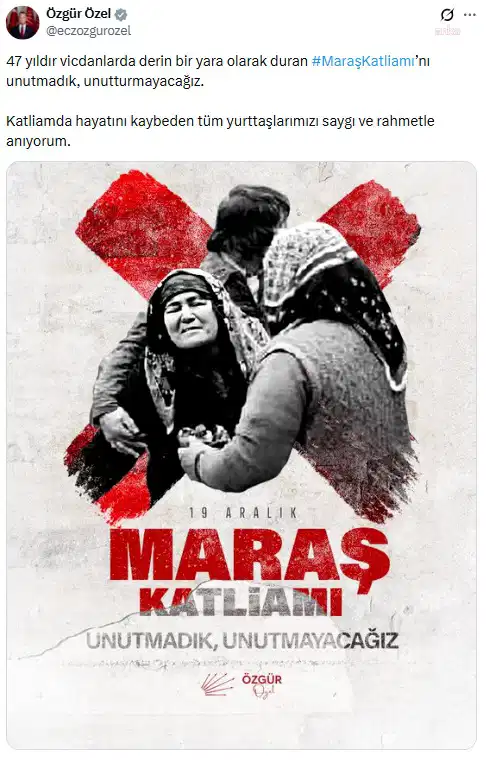 Cumhuriyet Halk Partisi (CHP) Genel Başkanı Özgür Özel, “47 yıldır vicdanlarda derin bir yara olarak duran Maraş Katliamı’nı unutmadık, unutturmayacağız. Katliamda hayatını kaybeden tüm yurttaşlarımızı saygı ve rahmetle anıyorum” dedi.