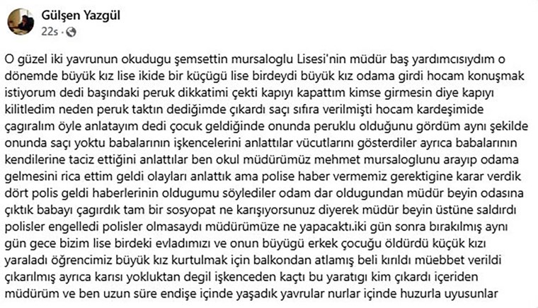 Şemsettin Mursaloğlu Lisesi’nde görev yaptığını anlatan Yazgül, “Büyük kız bir gün odama geldi, konuşmak istedi. Başındaki peruk dikkatimi çekti. Kapıyı kapattım ve sordum. Peruğunu çıkardı, saçları sıfıra vurulmuştu. Ardından kardeşini de çağırdı, onun da saçı yoktu. Babalarının işkencelerinden, vücutlarına yaptığı eziyetlerden ve cinsel tacizden söz ettiler” ifadesini kullandı.