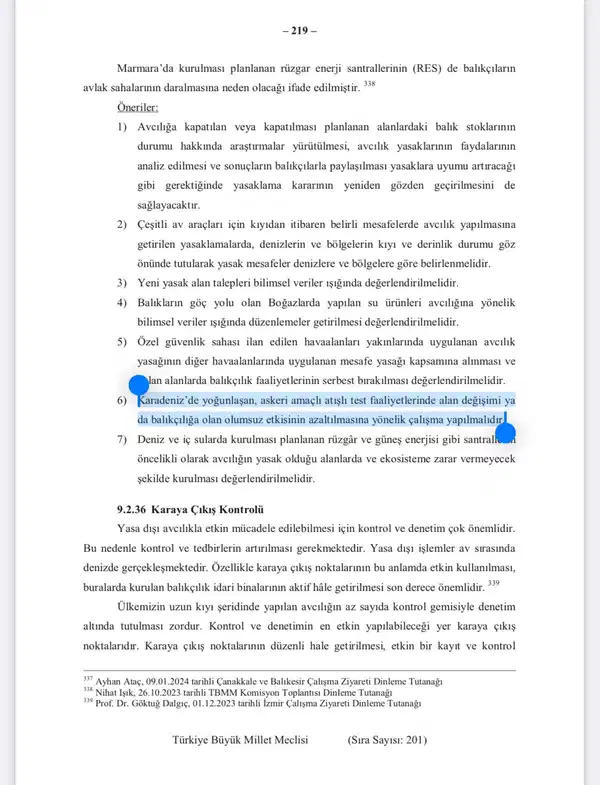 Raporda konuyla ilgili “Karadeniz’de yoğunlaşan, askeri amaçlı atışlı test faaliyetlerinde alan değişimi ya da balıkçılığa olan olumsuz etkisinin azaltılmasına yönelik çalışma yapılmalıdır” ifadeleri yer aldı.